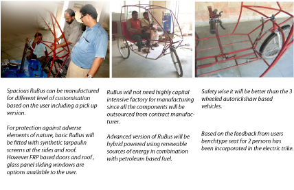Transportation Design Self Initiated Design Project Automobile happened to be my weakness. With thriving Indian economy and effort for infrastructure development such as roads even in rural areas, need for transport is increasing and cheaper automobiles in Indian context is essential. Many of the Indian automobile majors are trying to design and manufacture cheaper vehicles to met diverse demand. To meet this requirement, a project to design, develop and prototype a rural transportation vehicle was initiated by self. The prototyping is in advance stage and the vehicle is code named as RuBus. Most of the aggregates are outsourced from existing common 2/3/4 wheel automobiles to reduce cost, improved maintenance and repairability. RuBus uses a body on ladder chassis principle and is of open structure with FRP body panels over tubular structure. It can seat 8 adults comfortably and can be used for carrying goods also after folding the passenger’s seats. Total input costs will be within Rs. 1.00 lac. |