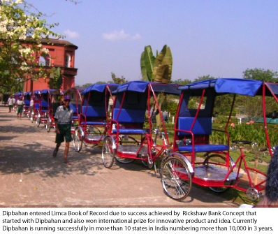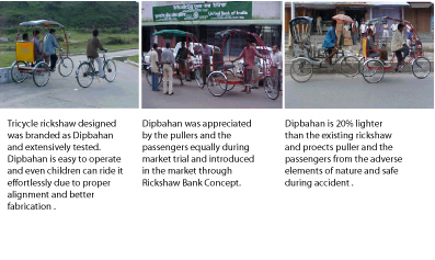 Design of a Tricycle Rickshaw The current practice for meeting the localized transportation needs of the population is varied and dependant on region, culture, economic capabilities, geographical locations and local administration. The issues of meeting localized transportation needs of vast masses of population that can not afford a personal vehicle and many lanes and streets are narrower to accommodate cars and buses needs consideration for alternative viable means that are contextual. Human powered tricycle rickshaw fulfills this need. An attractive, aesthetically pleasing, manually driven utility tricycle rickshaw can benefit a large number of populations even living on bare minimum resources. It would also generate employment to a large number of unemployed youth as rickshaw pullers. A tricycle rickshaw has been designed, developed and prototyped under a project for income generation activity related design development and commercial production started after successful transfer of Design and Technology. It has being implemented as Rickshaw Bank Project by an NGO, Center for Rural Development, Guwahati. Sponsored amount: Rs. 1.57 lacs