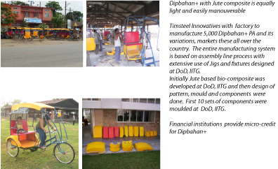 Initial effort was to replace seat and seat back with Jute Composite that was earlier made traditional way. Integrated approach in implementation and development of the Dipbahan for better aesthetics and integrity required scope of the work to be extended. Finally design development and implementation was for floor board (2 nos.- front and back), side panels (2 nos.- right and left), rear wheel mudguards (2 nos.- right and left), rear panel for advertisement space and the canopy. Effort was to replace aluminium sheet covered floor boards, netted structure at side and back used for covering luggage space, sheetmetal rear wheel mudguards, and rear panel & synthetic canvas based canopy. Entire structure of Dipbahan was redesigned and the newer version was branded as Dipbahan+