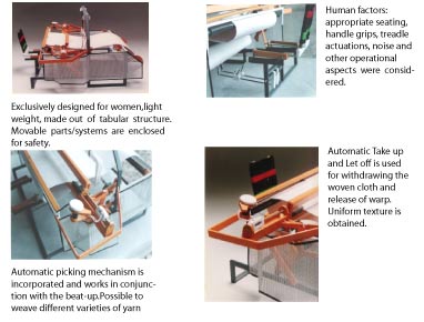 Design of a Semi-Automatic Handloom for Women. Product Design Project 3 However existing manual semi-automatic handloom like Nepal type pedal operated, except for an electric motor, is a powerloom in all other aspects and not suitable for women weavers. SimilarlyTARA semi-automatic handloom with automatic take-up and let-off mechanism was found unsuitableby the women weavers in NER . Semi-automatic handloom developed by CSTRI of Central Silk Board with automatic take-up and let-off mechanism was found to be too big and heavy for women weavers on field trial in NE Region. Aim of the project was to design an appropriate semi-automatic handloom for the women weavers. Semi-automatic handloom designed is modular, it is easy to manufacture, assemble and transport. Uses easily available handloom accessories. |