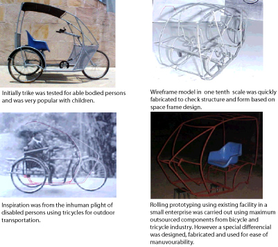 Transportation Design Self Initiated Design Project Aim of the project was to design a environmental friendly space frame based Human Powered Vehicle (HPV)- a tricycle for multipurpose use including usage by persons with lower limb Disability. Special features of the trycycle: Eco-friendly Tri-cycle for institutional campus that are quite big as well as airports, docks, recreational theme parks, big factory where distance from one place to another is significant to walk. Tricycle is functional, protects one from the adverse elements of nature, ergonomically designed and it has a aesthetically pleasing form. It can be used for various activities including for physical fitness and a leisurely vehicle for evening outings. It has been modified for use by lower limb disabled persons and customized to be powered by solar energy using photovoltaic cell for power generation. For optimum use of combination of energy sources, sophisticated electronics can be used for controlling the motorized operation using electric prime movers in conjunction with manual effort.