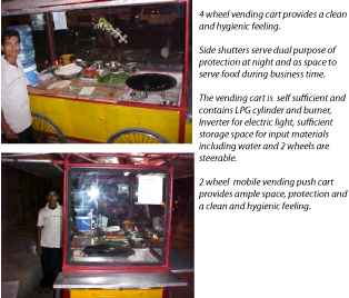 In India, there is a significant number of persons engaged in mobile vending including food vending ones and provides livelyhood to large number of persons. However these vending cart are of non-standard design and locally made that has the shortcomings of poor hygiene. Work was initiated to design 2 and 4 wheel mobile vending cart to cater to this decentralised sector. One 4 wheel vending cart for traditional Indian food to be served as fast food was designed and released in the market that received good response. Another 2 wheel push cart was also designed and an enterpreneur implemented it in the limited way in the market. |