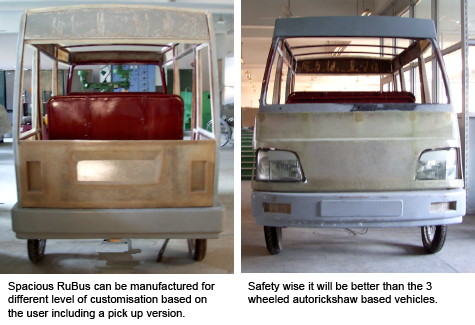 RuBus will not need highly capital intensive factory for manufacturing since all the components will be outsourced from contract manufacturer. Advanced version of RuBus will be hybrid powered using renewable sources of energy in combination with petroleum based fuel. For protection against adverse elements of nature, basic RuBus will be fitted with synthetic tarpaulin screens at the sides and roof. However FRP based doors and roof , glass panel sliding windows are options available to the user. |